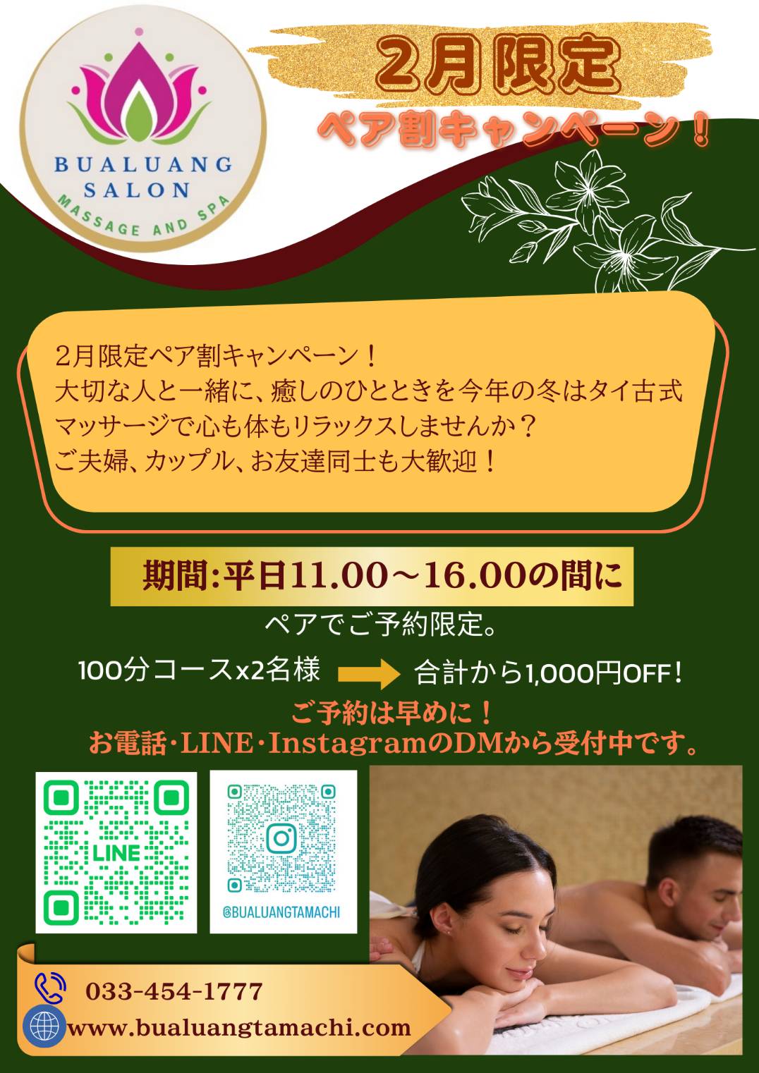 (ペア合計で2,000円の割引となります) - タイ古式マッサージはもちろん、アロマオイルマッサージなど、100分以上のコースであればお好きなコースをお選びいただけます。