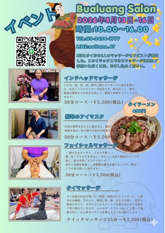 5月13日(水)から16日(土)までの4日間、タイ本国より、3名のベテランセラピストが来日いたします。